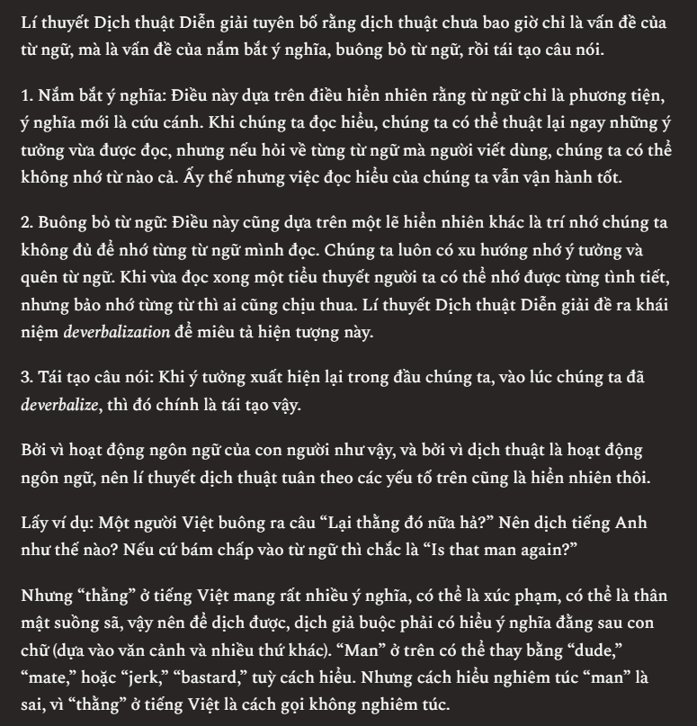 Hôm trước mình đọc bài về hậu trường dịch sách của Nguyễn Tuấn Linh, thì thấy anh này có nhắc tới Lý thuyết Dịch thuật Diễn giải (Interpretive Theory of Translation), cũng chính là thứ mà mấy năm gần đây mình áp dụng thường xuyên nhất trong công việc dịch thuật, vì mình thấy nó hợp lý nhất và đa năng nhất.