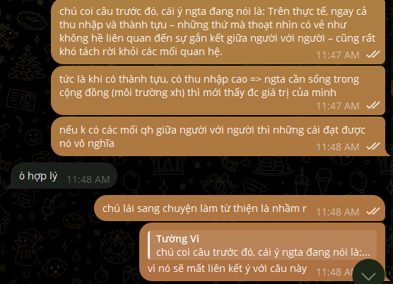 Thật ra câu cuối rất dễ hiểu sai, vì bản gốc tiếng Anh nó cũng sẽ khá chung chung, nếu bạn chỉ hiểu trên bề mặt chữ mà không liên kết các câu lại với nhau, bạn sẽ dễ dàng hiểu sai như chồng mình. (Mình để bản gốc câu cuối cho bạn tham khảo nè: What would income mean if there was no one we could share it with, no social environment to give it meaning?)