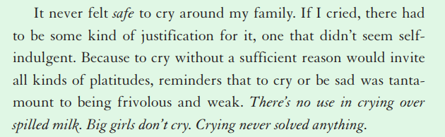 1. Chưa lần nào tôi thấy ổn để rơi nước mắt trước mặt gia đình. Vì nếu tôi mà khóc thì kiểu gì cũng cần phải có một lý do cho mấy giọt lệ đó, kẻo tôi lại thành ra một đứa mít ướt vòi vĩnh sự nuông chiều. Với lại khóc khơi khơi mà không có căn cớ gì thì chẳng khác nào nào thả cửa cho mấy lời khuyên sáo rỗng tuôn ra, nào là chỉ có lũ ăn hại mới suốt ngày sụt sùi, nào là khóc lóc là chuyện của lũ tào lao. Chén vỡ rồi sao lành, khóc chi cho mệt xác. Con gái lớn rồi thì không khóc nhè. Khóc cho lắm cũng chẳng ăn thua gì đâu.