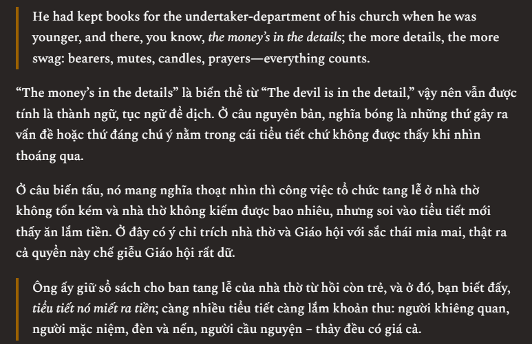 Em ví dụ: theo bản dịch này thì nguyên đoạn “nào là chỉ có lũ ăn hại mới suốt ngày sụt sùi, nào là khóc lóc là chuyện của lũ tào lao” là giải thích cho cụm “mấy lời khuyên sáo rỗng”, nhưng rõ ràng đó không phải lời khuyên mà chỉ có chê trách thôi.