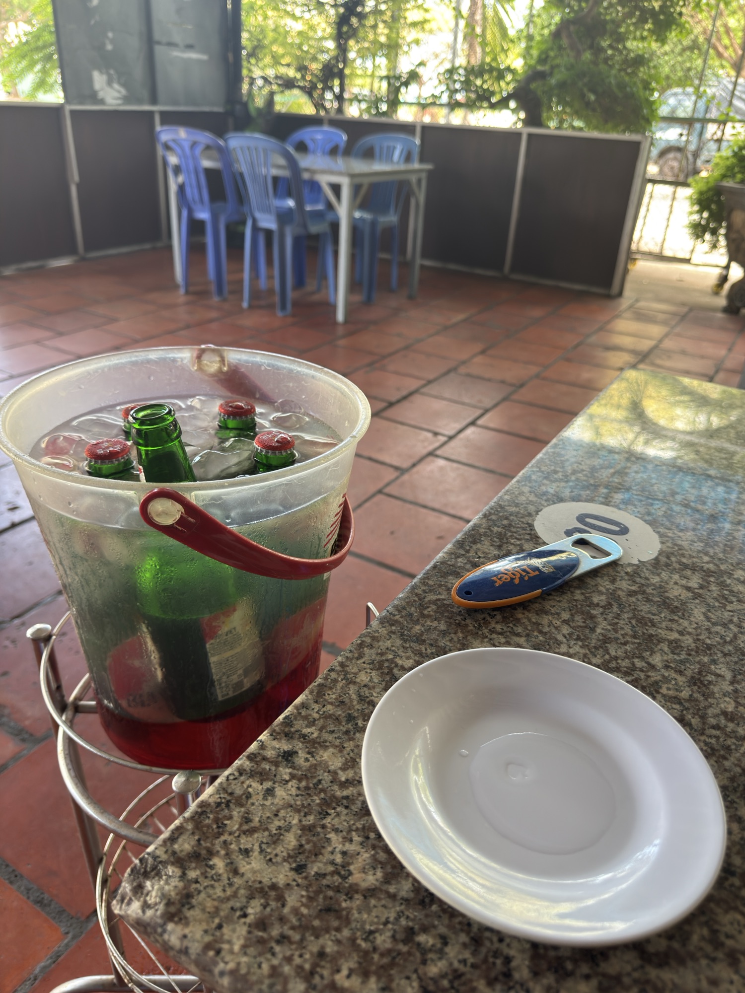 Cái chai đã mở nắp là chai đang uống, lâu lâu cầm lên hớp một ngụm rồi lại đặt vào xô đá để giữ lạnh, chứ thời tiết bây giờ nóng như thế này để ở ngoài chừng năm phút là nó đã nguội ngắt, mà mình thì không uống bia với đá nên nó càng nguội nhanh hơn nữa. Vì hay dùng tới xô đá, nên mình nhờ mấy cô phục vụ để cao lên để lấy cho tiện.
