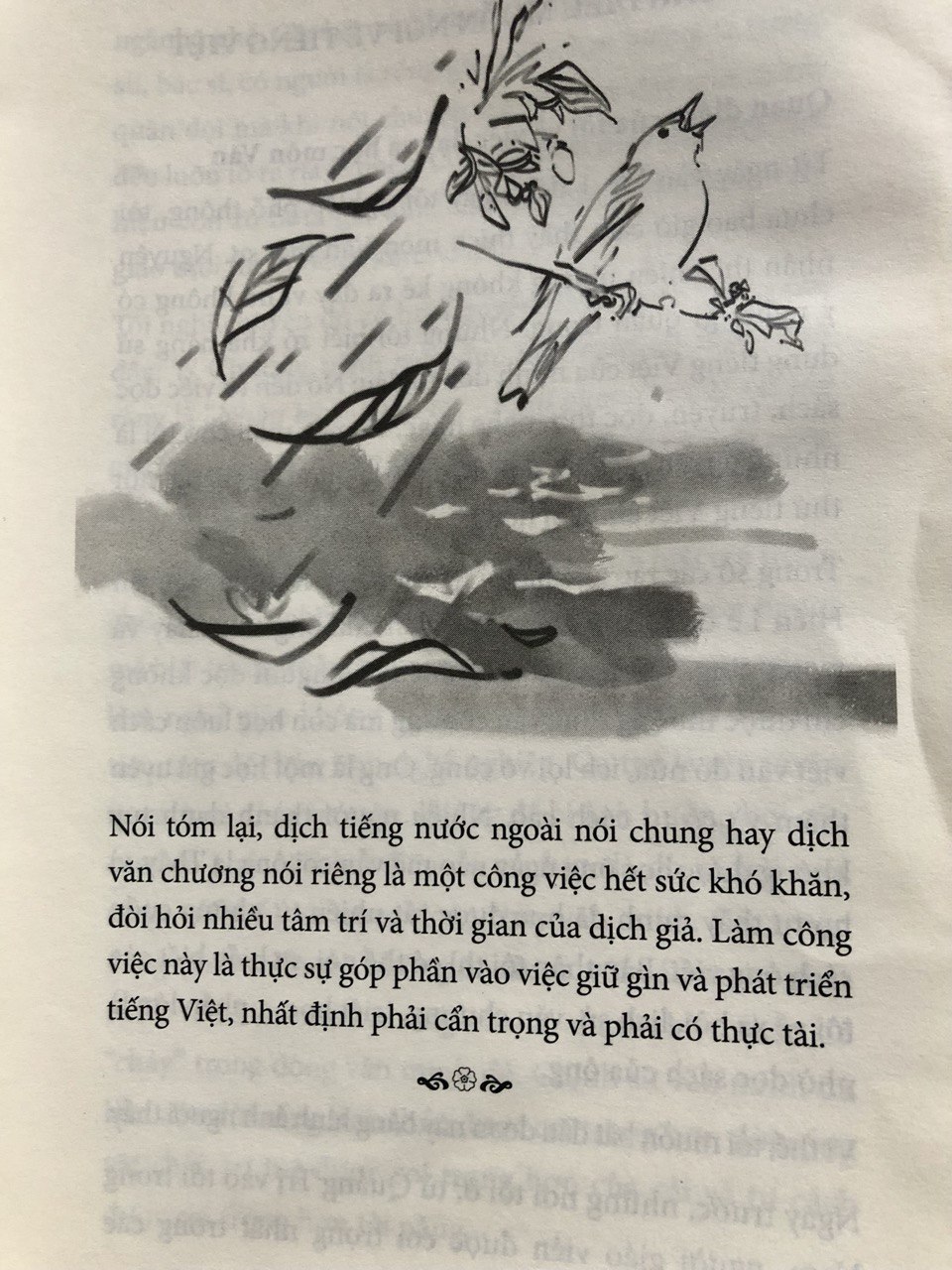 Hôm trước tui đọc được một bài phỏng vấn một phiên dịch, trong đó có đoạn phiên dịch này nói: “Có nhiều người hỏi tôi có thể dạy họ tiếng Việt không, hay có cuốn sách nào để học được tiếng Việt như anh, tôi chỉ trả lời: điều này xuất phát từ tình yêu, từ trái tim. Tôi đọc sách và truyện từ nhỏ, hồi mà người viết sử dụng tiếng Việt một cách trau chuốt, và cứ thế, mọi thứ tự nhiên ngấm vào mình. Kiến thức của tôi về tiếng Việt cũng chỉ là những điều được dạy trong sách giáo khoa thôi chứ chẳng có gì cao siêu cả. Nếu bạn cũng có một tình yêu, tự thân bạn sẽ bỏ công tìm hiểu, chẳng cần điều gì thúc ép hay thần bí”. Tự dưng tui thấy đồng cảm với người dịch này, dù trước đó cũng không biết ổng là ai. Có lẽ là vì tui cũng có một tình yêu bền bỉ dành cho tiếng Việt, vì tui cũng được những câu chữ trong sách tưới tắm cho tâm hồn mình từ hồi còn nhỏ xíu.